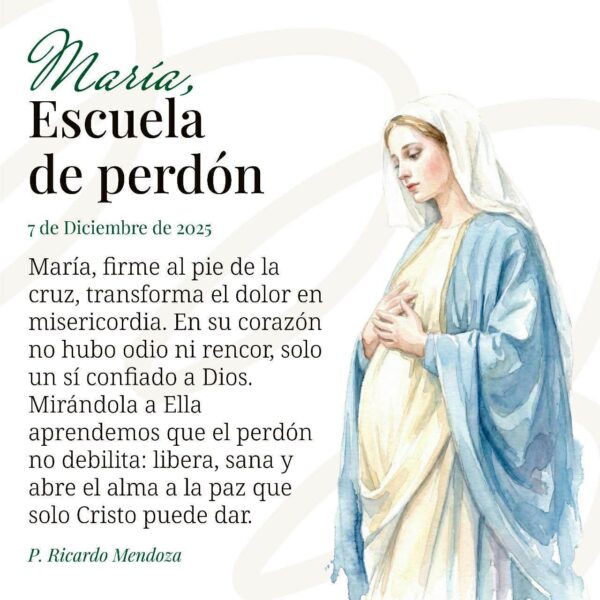 Su ejemplo nos invita a perdonar incluso cuando la herida permanece abierta. Si alguien nos ha causado daño y sentimos todavía esa “espada” clavada, pidamos la gracia de perdonar como ella perdonó.