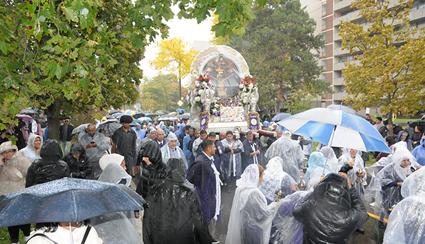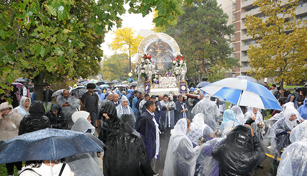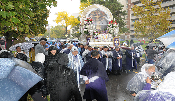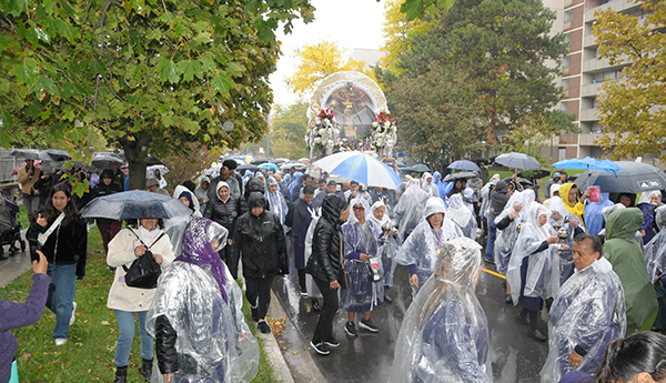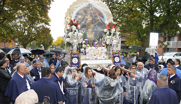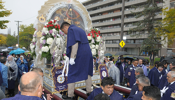Por Víctor R. AGUILAR.- Bajo una intensa lluvia, se realizó el recorrido procesional del Señor de los Milagros en la ciudad de Toronto. El evento climatológico no fue impedimento para que cientos de fieles siguieran el anda del Cristo Moreno, cargada con fervor por los integrantes de la Hermandad del Señor de los Milagros de Ontario. La devoción y el amor al Cristo de Pachacamilla se impusieron al mal tiempo, convirtiendo la jornada en un testimonio vivo de fe y perseverancia.