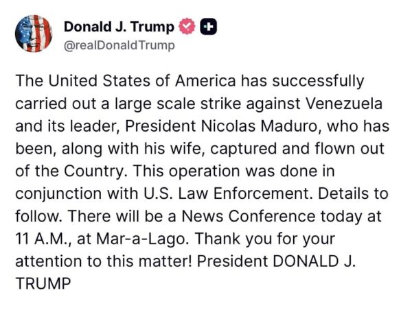El anuncio fue difundido por Trump a través de sus redes sociales, donde aseguró que la acción se realizó en coordinación con agencias de seguridad estadounidenses y que los detalles serán ampliados en una conferencia de prensa convocada en Mar-a-Lago.